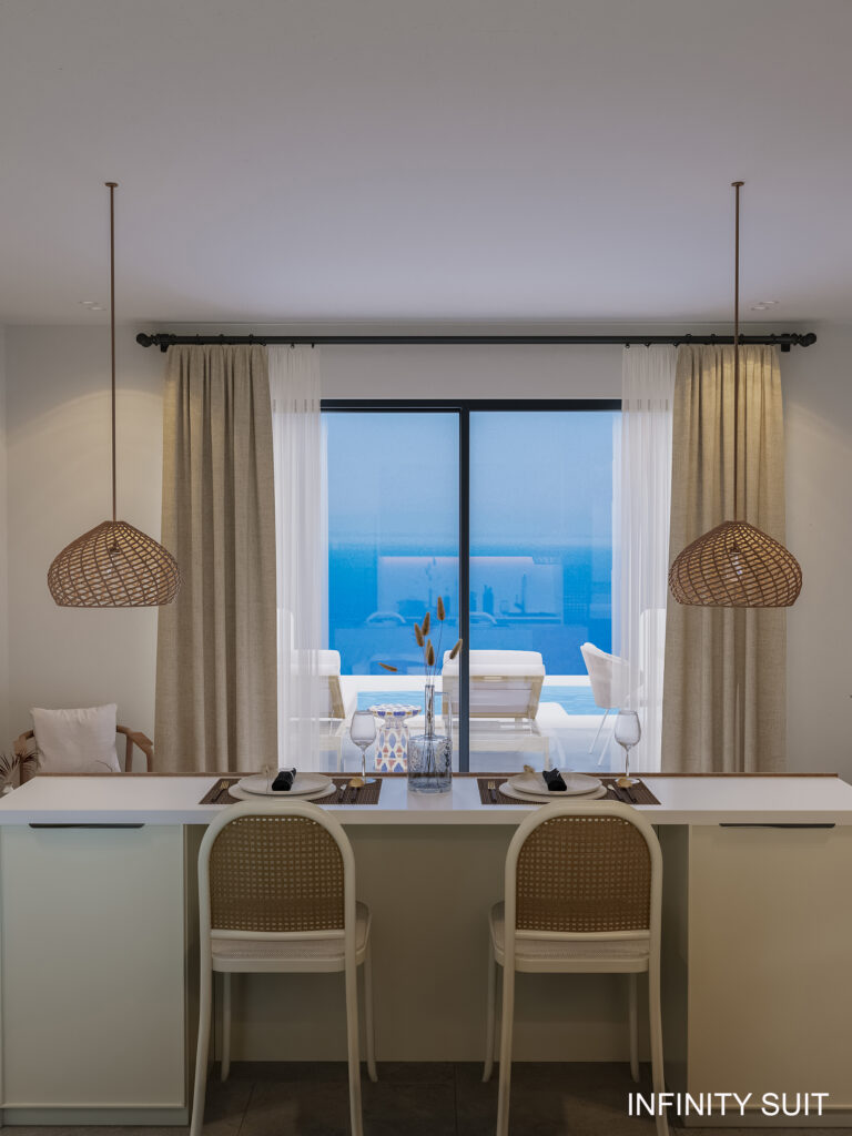 2. Private pools: Each apartment in the complex is equipped with its own infinity pool, which adds luxury and comfort to the daily life of residents. The water in the pools creates a sense of infinity and integrates with the sea view.