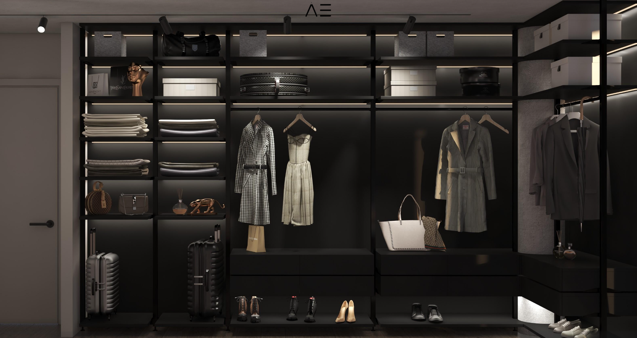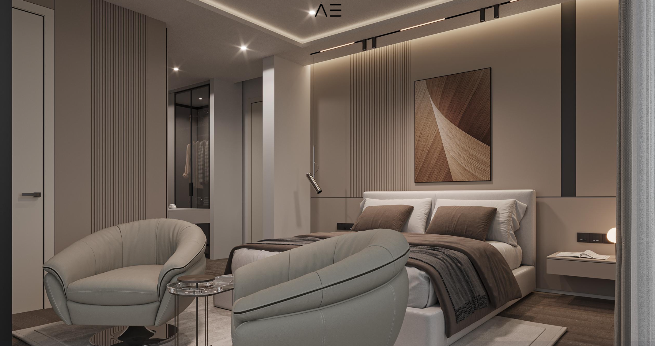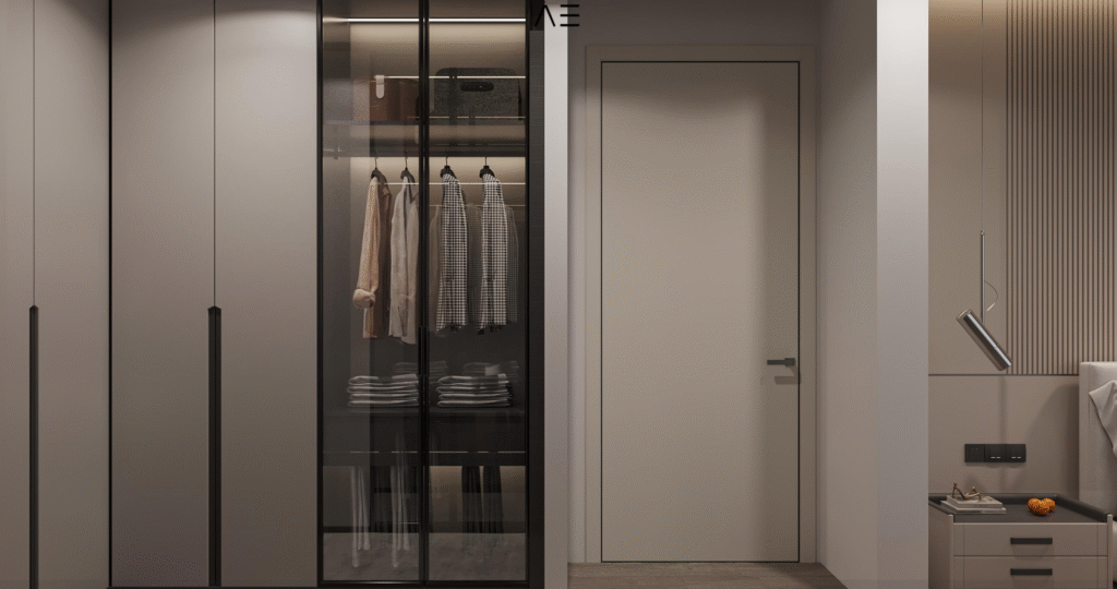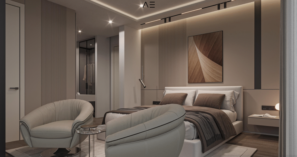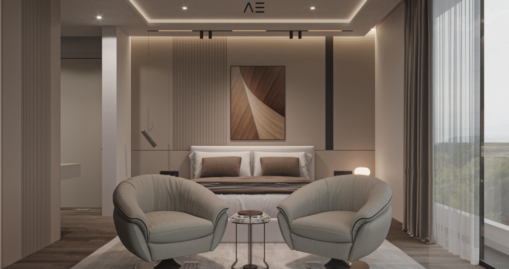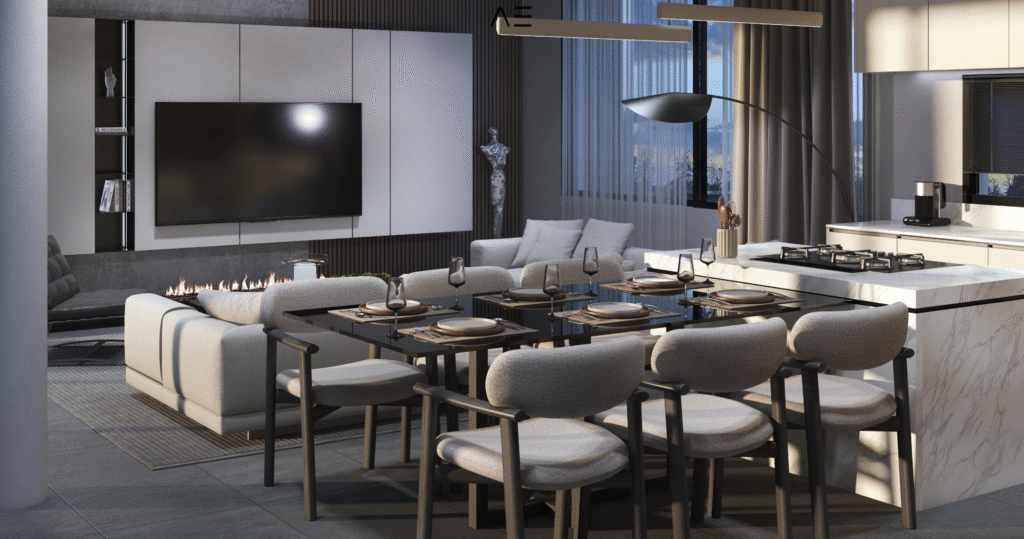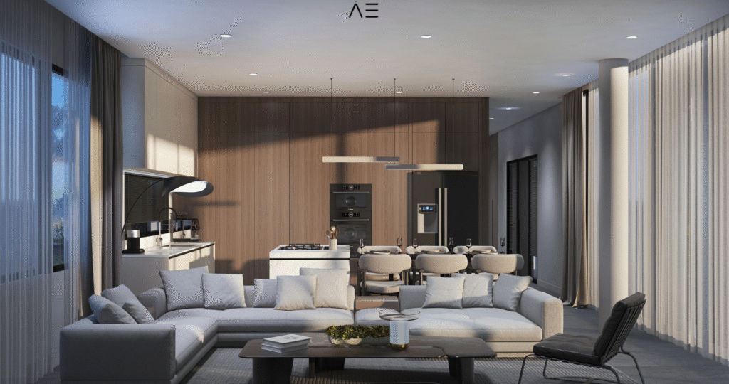 Glossy acrylic kitchen cabinets (color/model options),laminated parquet bedrooms, natural marble or wood staircase (optional), floor-to-ceiling wardrobes, ceramic tiles in bathrooms and kitchen walls – all with customizable finishes.