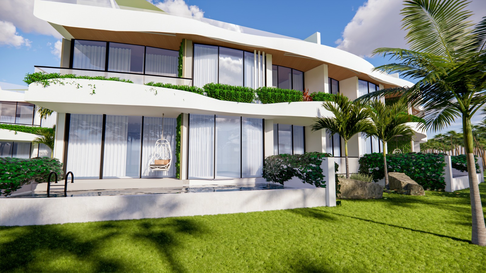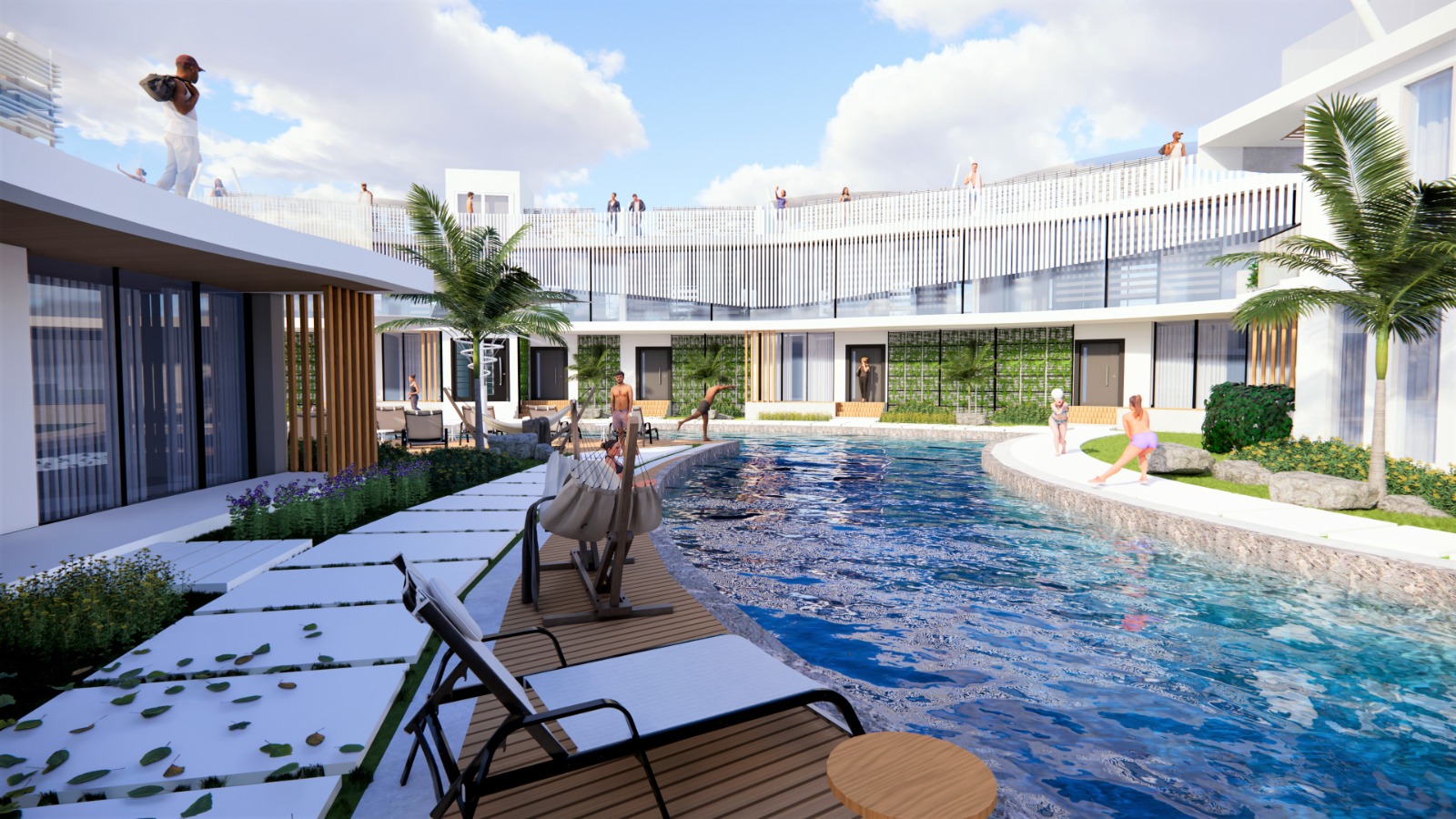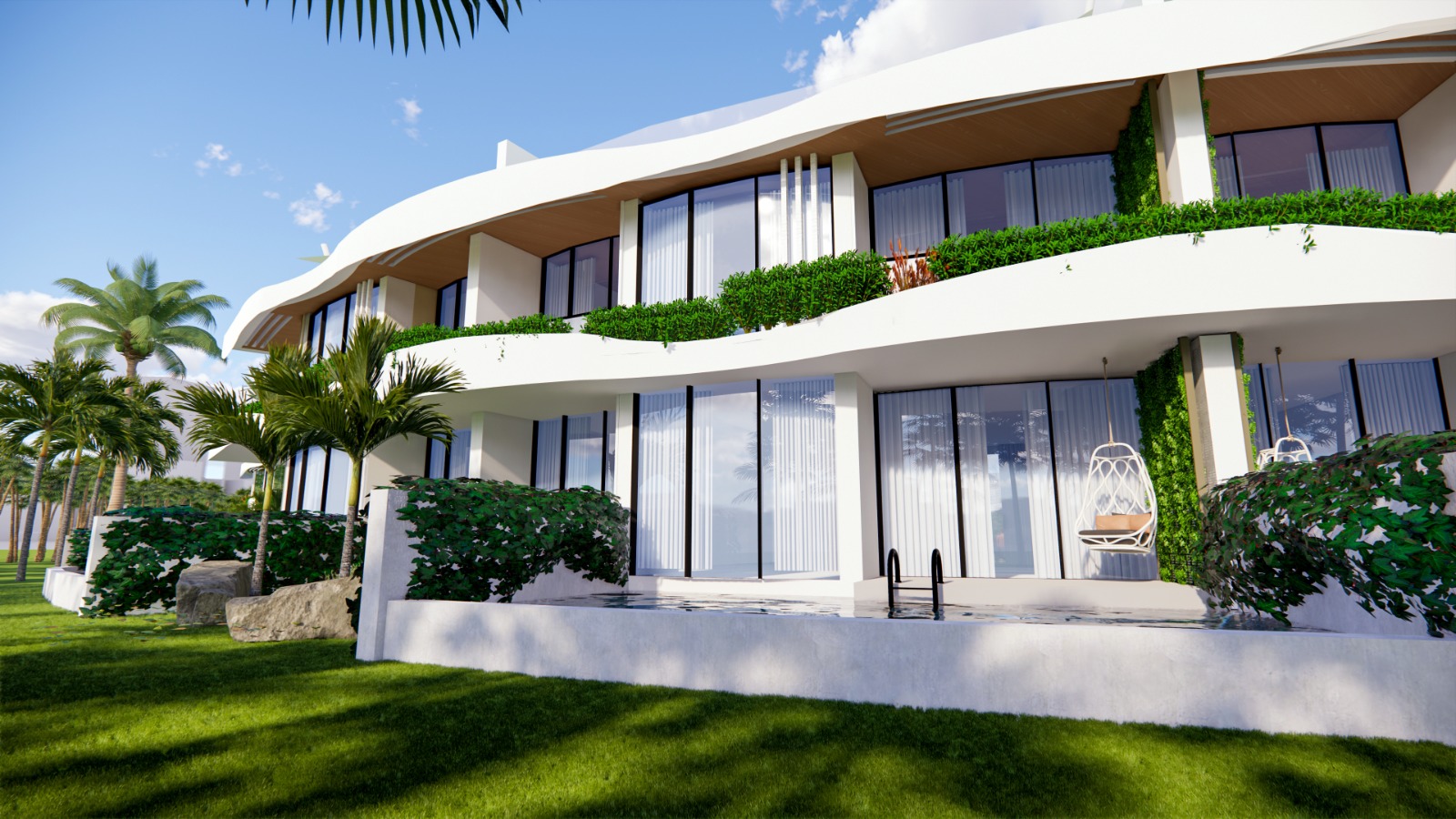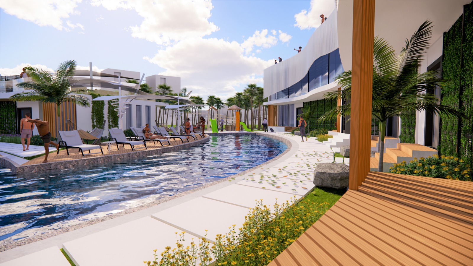 Zwembad van 435 m2, beveiligde ingang, appartementen op de 1e verdieping met een privéterras, appartementen op de begane grond met een privétuin, zwembad en speeltuin voor kinderen, privéparkeerplaats voor elk appartement, groene zones, bar bij het zwembad, direct uitzicht op zee vanuit de appartementen in blok A, optie privézwembad voor de appartementen in blok A, afvalwaterzuivering, AC-infrastructuur, verwarmde vloer in de keukens, woonkamers en badkamers in alle appartementen.