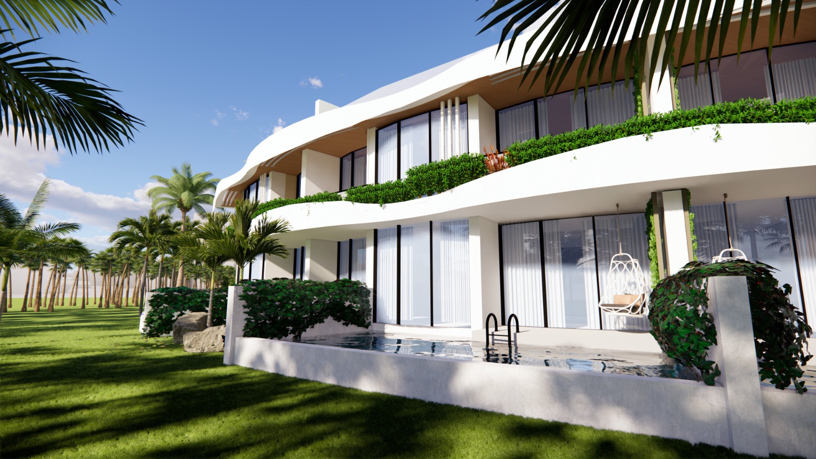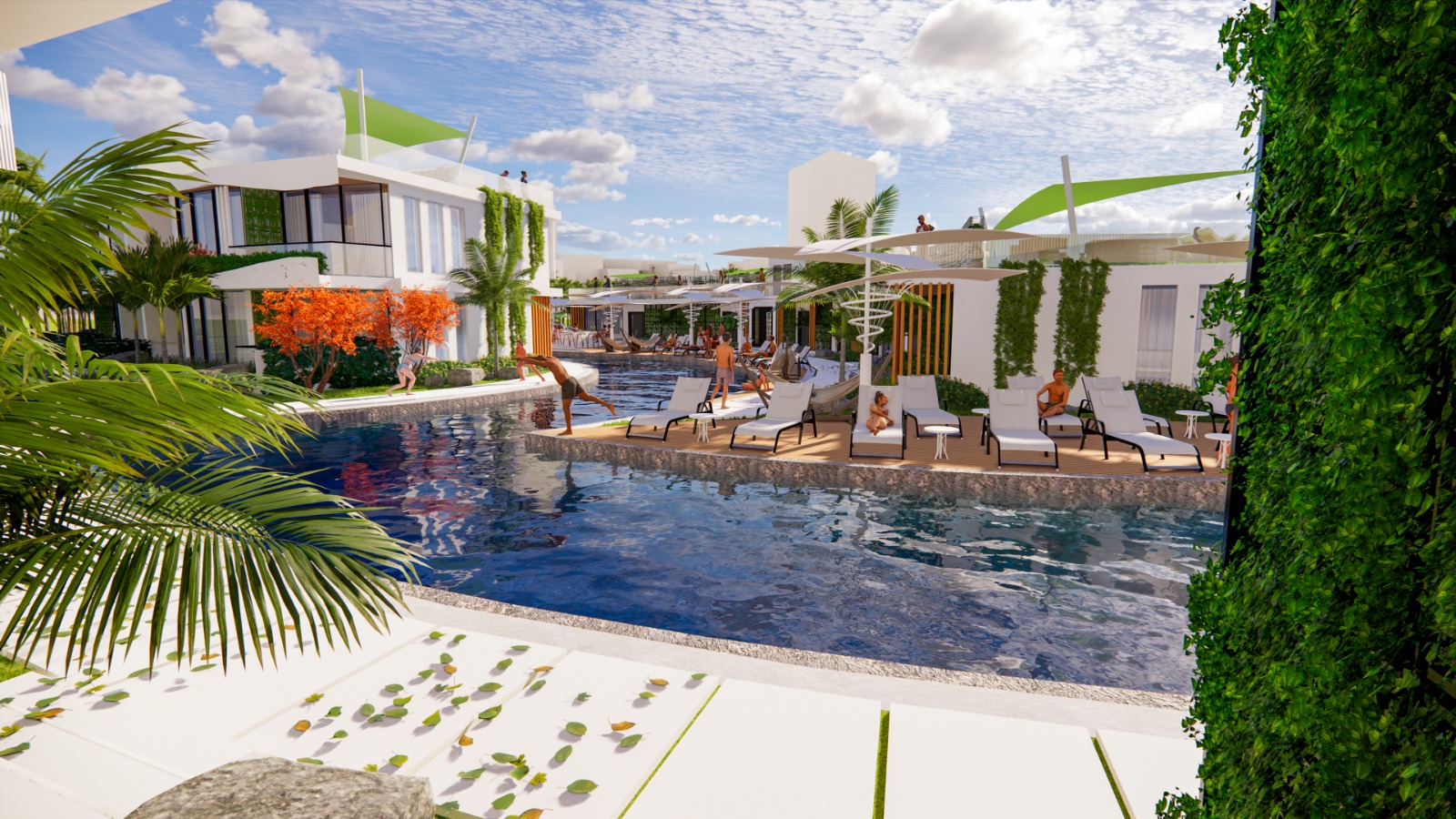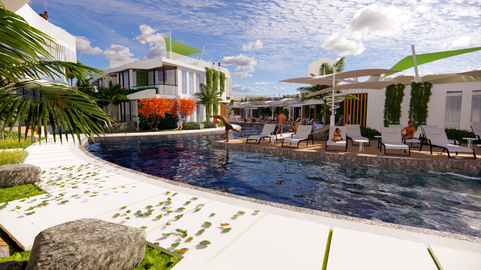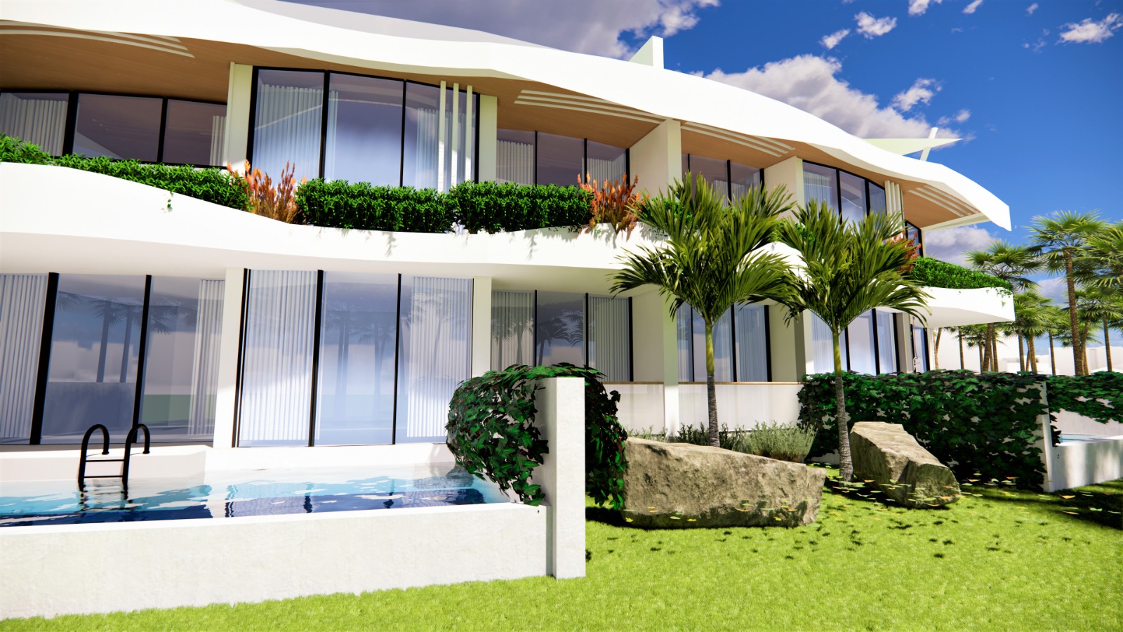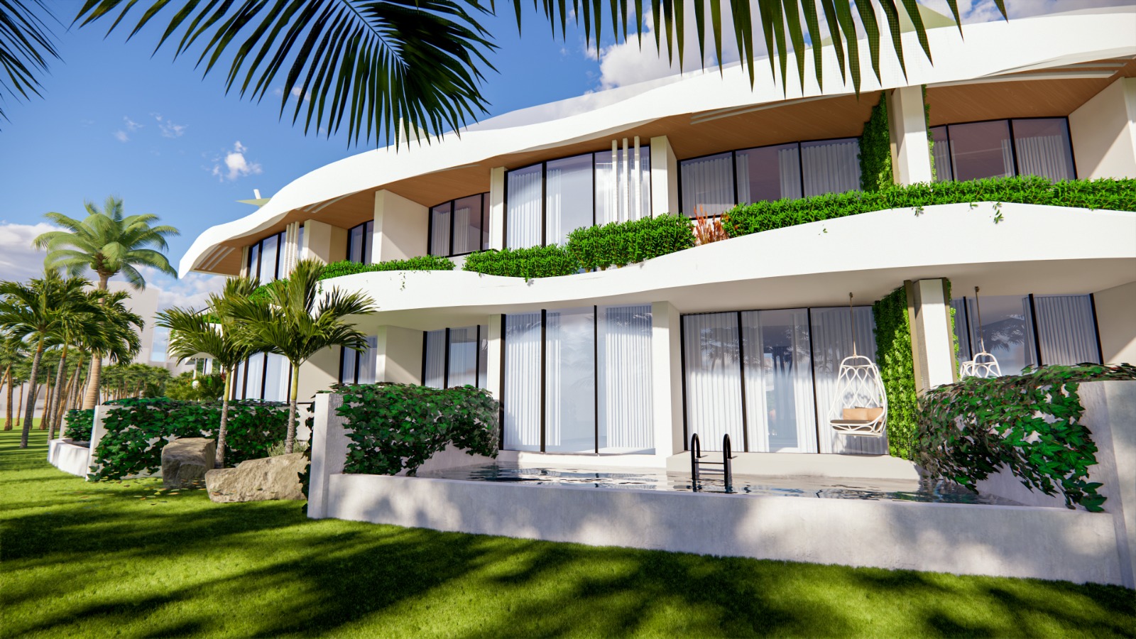 Zwembad van 435 m2, beveiligde ingang, appartementen op de 1e verdieping met een privéterras, appartementen op de begane grond met een privétuin, zwembad en speeltuin voor kinderen, privéparkeerplaats voor elk appartement, groene zones, bar bij het zwembad, direct uitzicht op zee vanuit de appartementen in blok A, optie privézwembad voor de appartementen in blok A, afvalwaterzuivering, AC-infrastructuur, verwarmde vloer in de keukens, woonkamers en badkamers in alle appartementen.