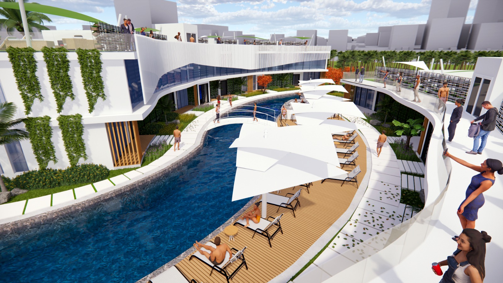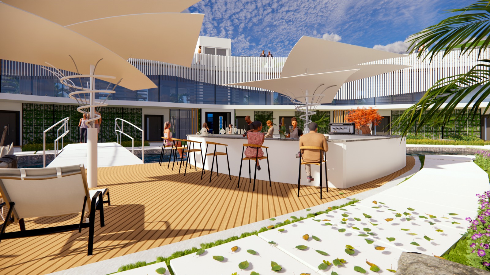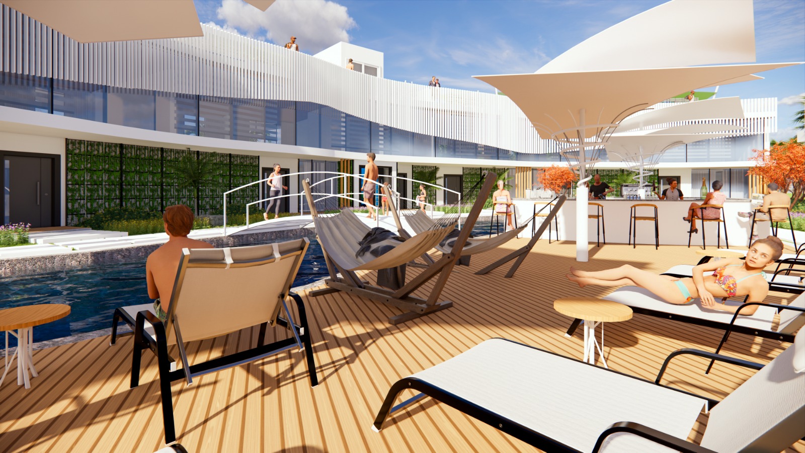 Een licht briesje en de warme zon nodigen gasten uit om alles te vergeten en te ontspannen onder gezellige parasols en op comfortabele ligbedden. Voedselzones, restaurants en cafés verspreid langs de kust voldoen aan de meest verfijnde smaakvoorkeuren.